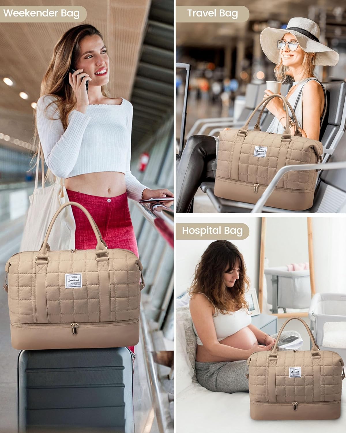 Large Duffle Bag for Travel, Puffer Weekend Bags for Women Travel Tote, Carry on Duffel Bag for Airplanes, 18 Inch Personal Item Bag Gym Bag Women, Coffee