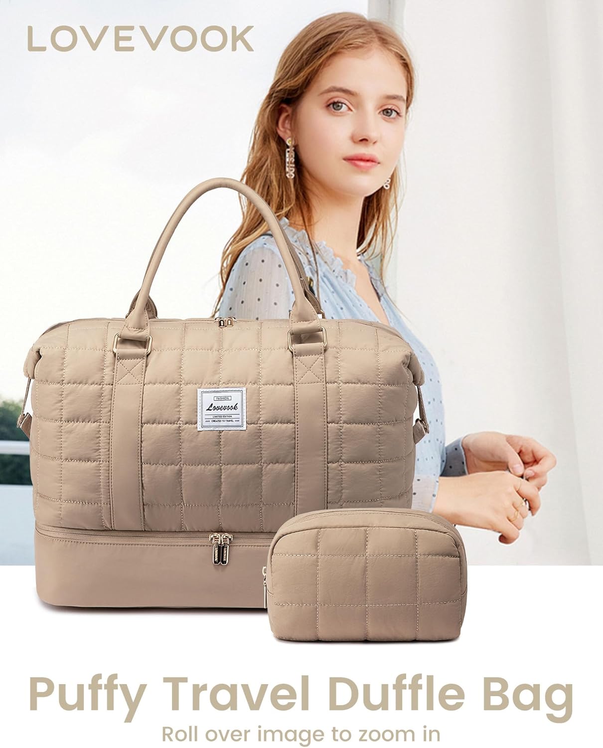 **Product Title:** Large Duffle Bag for Travel – Puffer Weekend Bags for Women, Carry-On Duffel Bag for Airplanes, 18-Inch Personal Item Gym Bag – Coffee